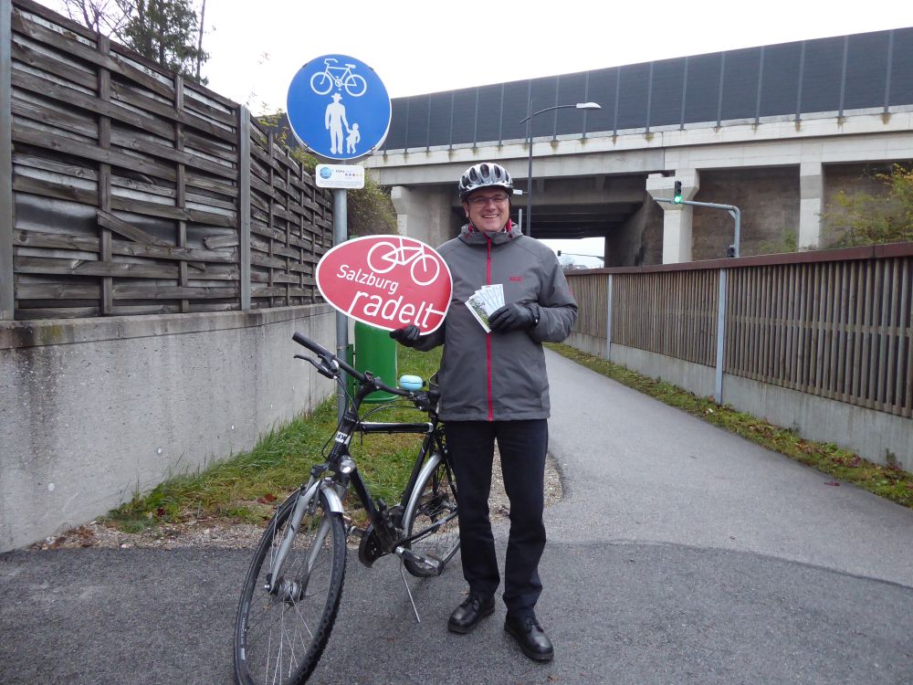 Klaus Hochfellner radelt ganzjährig, außer bei Niederschlag, da nutzt er seine Öffi-Jahreskarte. Er ist begeisterter Radfahrer und engagiert sich gemeinsam mit Georg Schwab auch als ehrenamtlicher Radbeauftragter von Bergheim.
