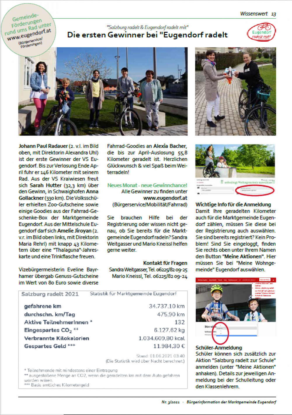 Eine große Motivation zum Mitmachen ist aber die Verlosung von Preisen. Eugendorf führt schon während des Aktionszeitraumes laufend Verlosungen durch und veröffentlicht die glücklichen Gewinnerinnen und Gewinner online und in der Gemeindezeitung. Und auch die kleinen Radlerinnen und Radler kommen in Eugendorf auf ihre Kosten.