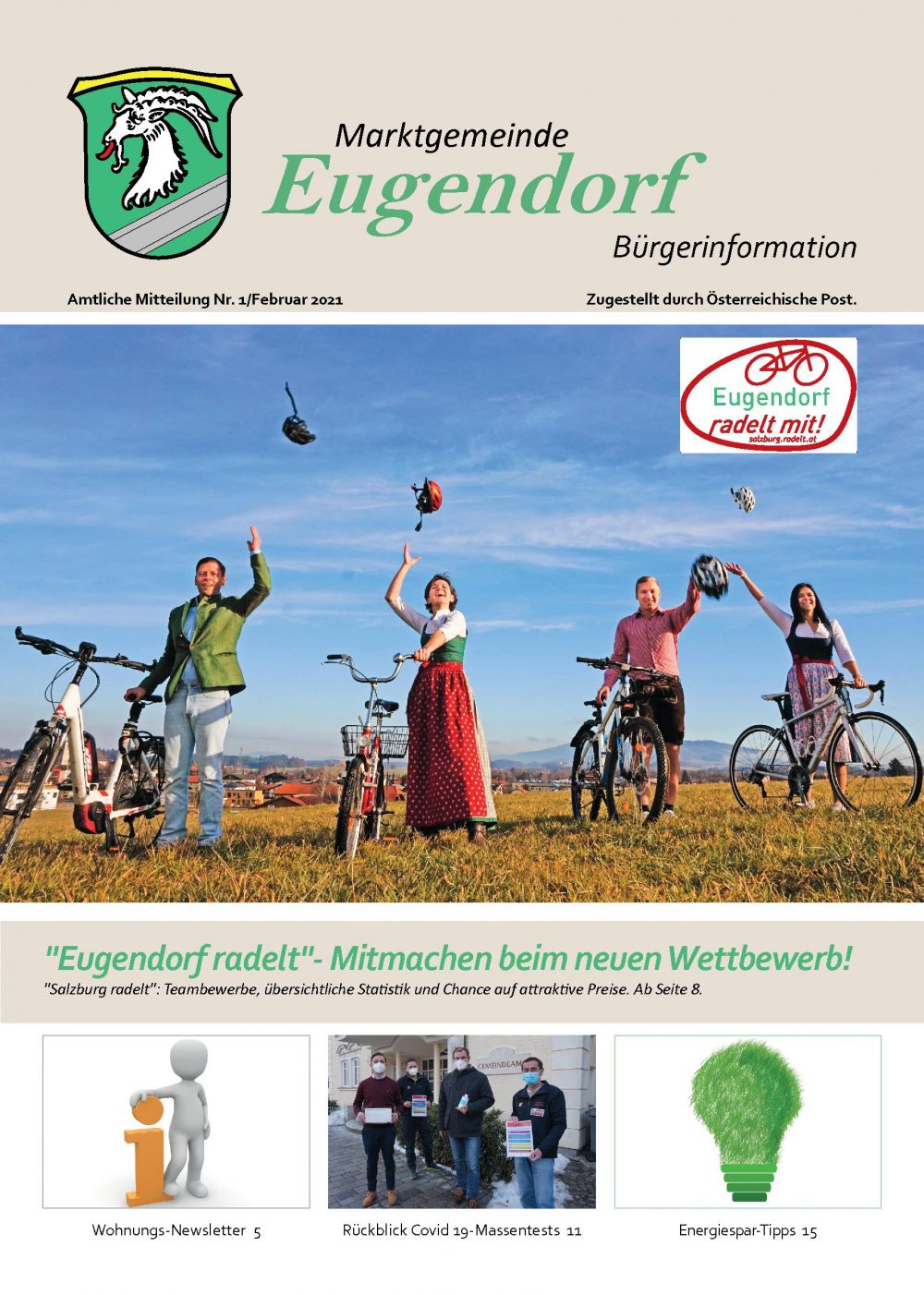 Bereits die Februar-Ausgabe der Eugendorfer Gemeindezeitung stand ganz im Zeichen von "Salzburg radelt", aber auch Gemeinde-Homepage und Gem2Go werden genutzt, um die BürgerInnen über die Rad-Aktion in Eugendorf zu informieren und über den gesamten Aktionszeitraum von 20. März bis 30. September informiert zu halten. In den nächsten Ausgaben der Gemeindezeitung ist jeweils eine Seite nur fürs Radfahren reserviert.