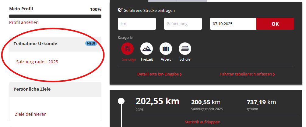 In deinem Profil kannst du dir deine persönliche Urkunde mit allen Details, die du während der Hauptaktion 2025 geschafft hast, downloaden! Neben der geradelten Distanz werden auch weitere Angaben wie erreichte Trophäen, vermiedenes CO2, gespartes Geld usw. angezeigt. Einfach ausdrucken - aufhängen - weiterradeln!
