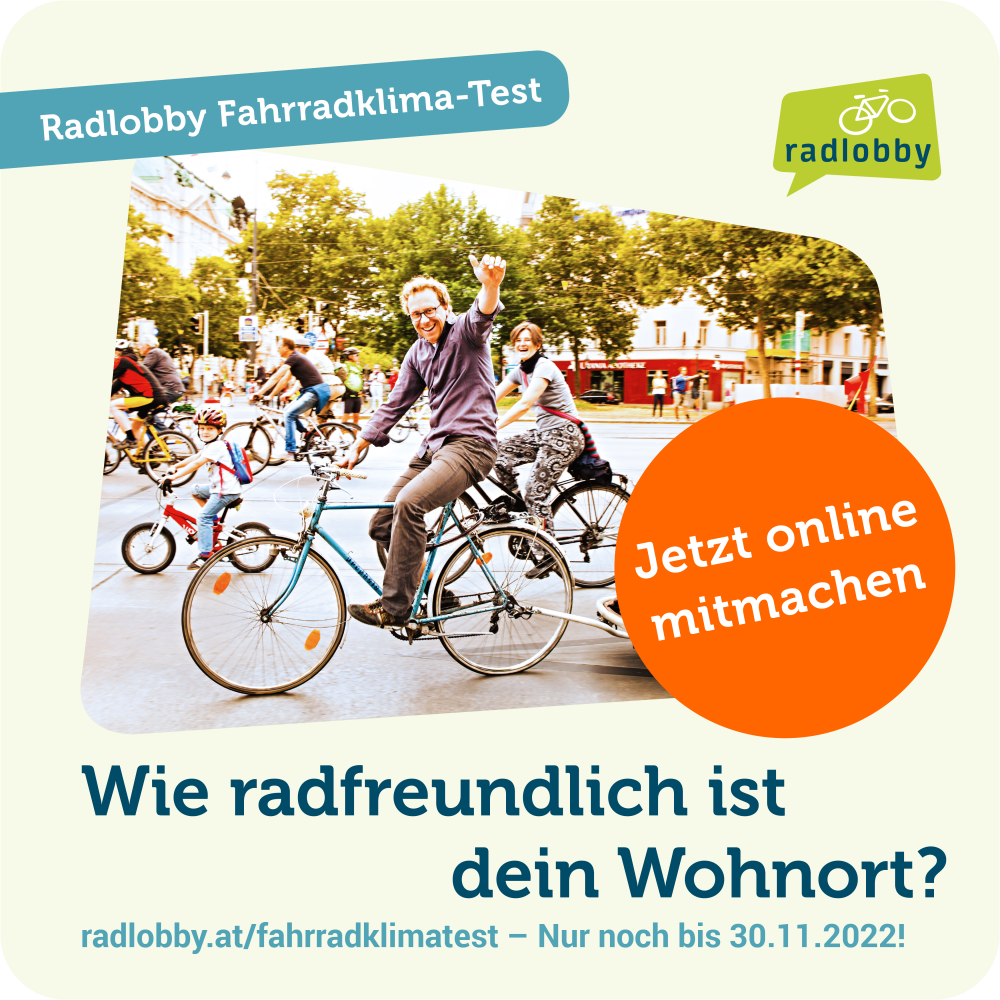 Der Radlobby Fahrradklima-Test erfasst die Zufriedenheit von Menschen, die ihre Alltagswege in Österreich mit dem Fahrrad zurücklegen. Von September bis Ende November 2022 können Radfahrende das Fahrradklima in ihren Städten und Gemeinden über unseren Online-Fragebogen bewerten.