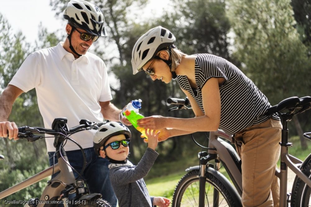 Beim regelmäßigen Radfahren kann es sinnvoll sein kleine Anstecklichter und eine Regenjacke immer mit dabei zu haben, um für jede Wetterlage gerüstet zu sein. Besonders bei langen Ausfahrten sollte ausreichend Wasser mitgenommen werden. Die Trinkflasche kann bei vielen Rädern mit Flaschenhaltern am Rahmen verschraubt werden, oder wie hier im Bild mit Adaptern oder flexiblen Halterungen wie der ANYWHERE von SKS überall angebracht werden.